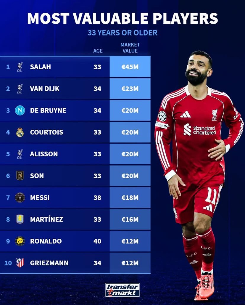 德轉33歲+球員身價前10:薩拉赫4500萬第1,梅西第7,C羅第9