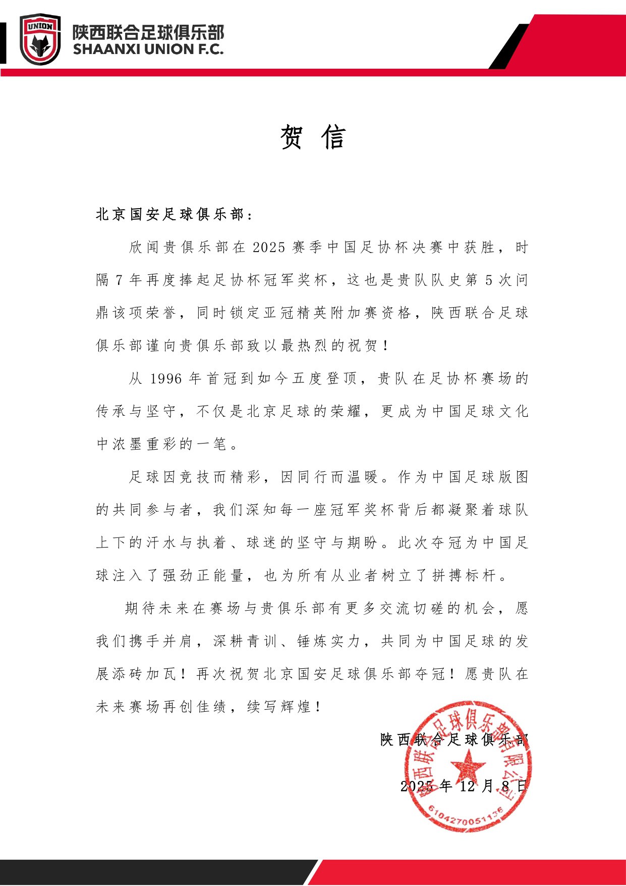 陜西聯合祝賀國安奪冠:足球因競技而精彩,因同行而溫暖